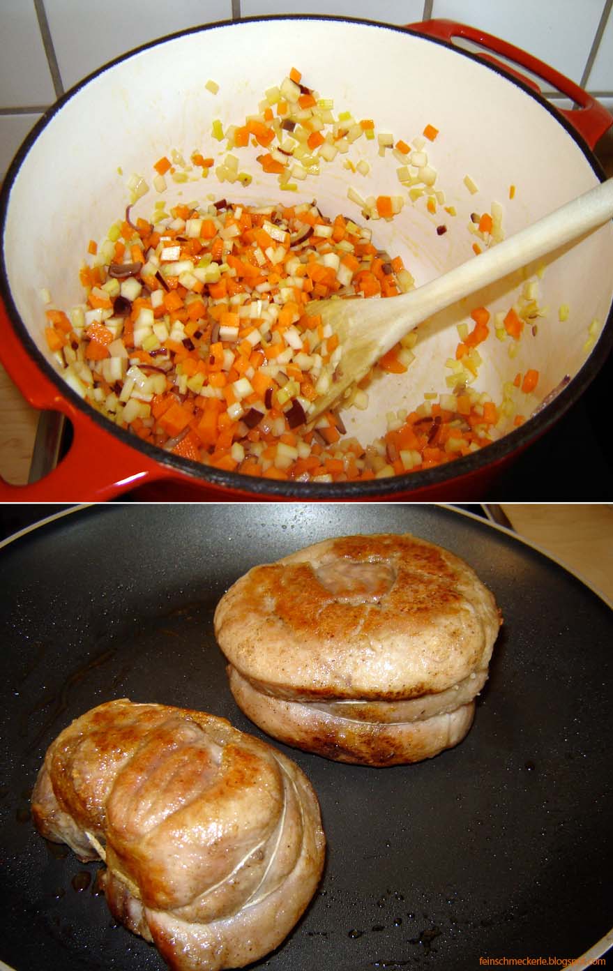 Rausnehmen, und den Bratensatz mit 250 ML Weißwein und 250 ML Fleischbrühe ablöschen und vom Boden lösen.