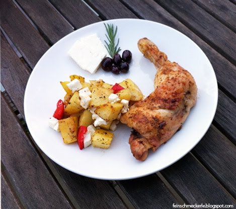 Danach das Huhn (wir nehmen 4 Hühnerschenkel) parieren, mit Salz, Pfeffer, Paprika und griechischen Kräutern würzen. Wir geben gerne noch Souvlaki-Gewürz dazu, das haben wir noch vom letzten Griechenland-Urlaub.