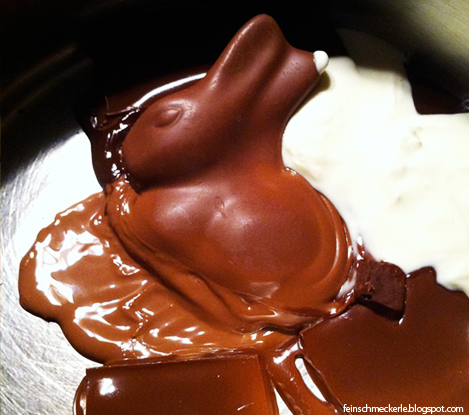 - 100 g Schokolade (normal dunkel – aber in diesem Fall ein Osterhase) mit etwas Crème fraîche schmelzen lassen