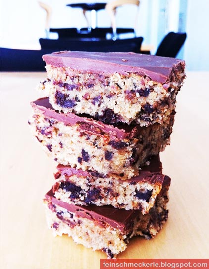 Nach dem Erkalten wird das Ganze mit 200 g flüssiger Kuvertüre bestrichen und sobald die Glasur erkaltet ist  in Rechtecke geschnitten.