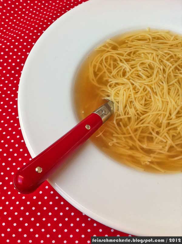 Wer mag (ich mag) entfettet dann die Brühe mit Hilfe eines Fettkännchens – ich friere sie dann gleich ein – und genieße fast täglich meine aufwärmende Nudelsuppe. Soulfood deluxe!