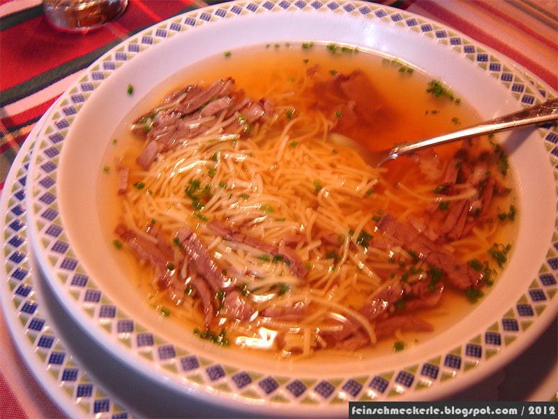 Begonnen haben wir mit einer Rinder(kraft)-Brühe mit Nudeln und hauchzartem Rindfleisch als Einlage – und genau so muss sie sein!