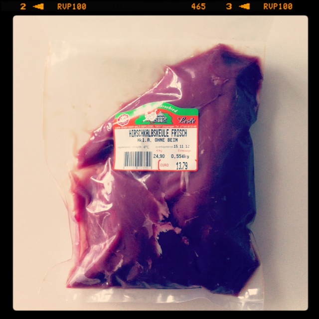 Los ging es bereits Samstag auf dem Markt. Ein passender Blaukrautkopf war schnell gefunden. Und nachdem Frau Excellensa auf Twitter von der Kombi Schupfnudeln, Baukraut und Wild erzählt hatte, war ich nicht zu halten. Am Wildstand meines Vertrauens hüpfte eine Keule vom Hirschkalb in meinen Einkaufskorb. Ich wollte natürlich nicht unhöflich sein und das arme Ding abweisen…