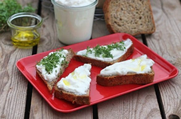 Abends gibt’s dann oft Vesper. Ich esse so gerne Brot – da könnte ich wirklich nie low carb leben. Früher gab’s oft Aufschnitt. Jetzt setze ich auch hier oft auf Brot mit Quark, etwas Leinöl und verschiedenen Toppings. Frische Kräuter, Kresse oder auch Radieschen kommen regelmäßig auf das Brot. Mein Tipp: Lasst den Quark ein paar Stunden abtropfen. Dann hat er fast Frischkäse Konsistenz!