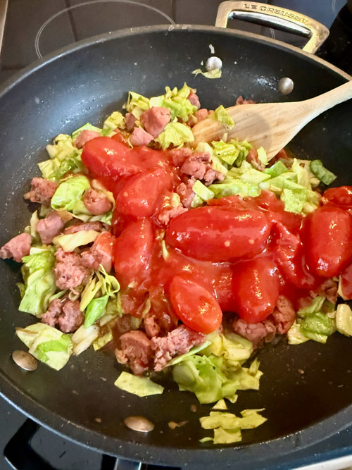 1. Die Salsiccia aus der Pelle drücken und in einer großen Pfanne ohne zusätzliches Fett anbraten – sie bringt genug davon mit.
