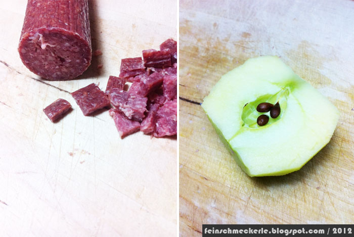 - 200 g Mettwurst fein würfeln und kurz mitdünsten – da ich keine bekam, gab es eine weiche, leckere Bio-Rindssalami
