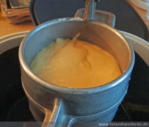 - Jetzt entweder Spätzle ins Wasser schaben – oder so wie ich Omas Spätzlepresse mit Teig befüllen