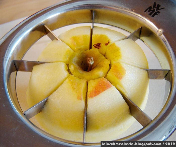 - Äpfel schälen, in kleine Stücke schneiden und vorsichtig unterheben
