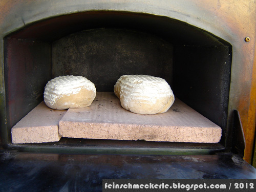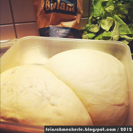 - Parallel kann man jetzt schon mal den Ofen vorheizen (volle Pulle!) – wahlweise mit Blech oder Backstein