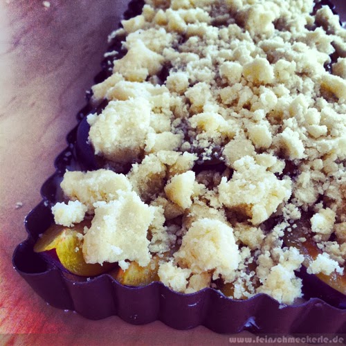 - Die Masse dünn auf den Mürbeteigboden geben